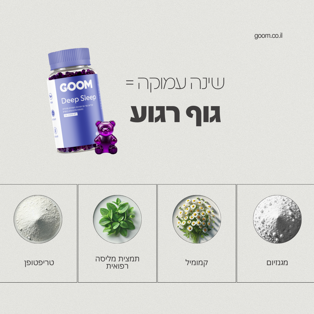 Deep sleep מתבסס על פורמולה ייחודית שמכילה רכיבים טבעיים כמו ל-טריפטופאן, מגנזיום, מינרלים מקבוצת B ותמציות צמחי מרפא, שנבחרו בקפידה כדי לספק פתרון מקיף ויעיל לשינה טובה יותר – בצורה טבעית וללא תלות.