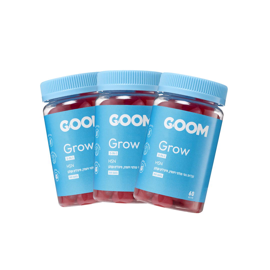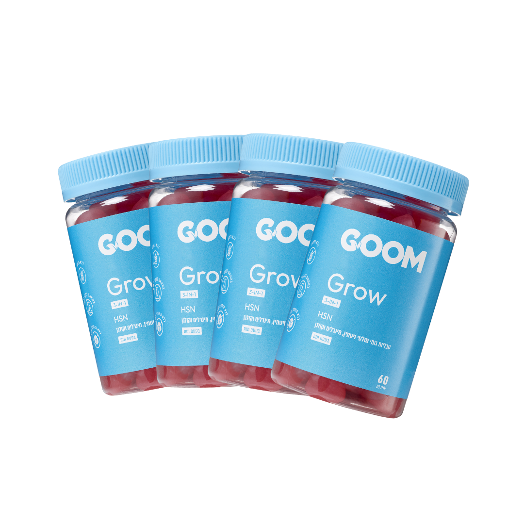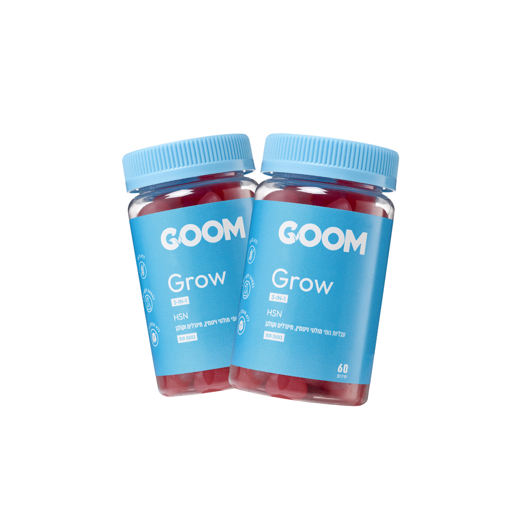 Grow מכיל פורמולה ייחודית עם 14 רכיבים פעילים - כולל קולגן, ויטמינים, מינרלים ורכיבים תומכים כמו ביוטין, כולין ואינוסיטול - כולם יחד בגומי טעים אחד